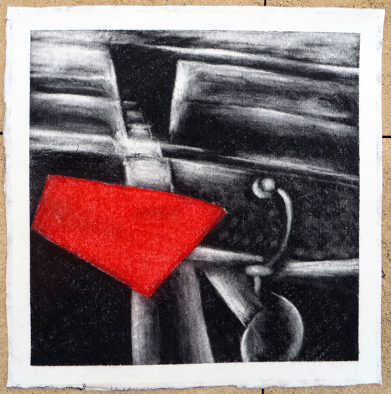 The next one is charcoal rubbed thickly into a sheet of printmaking paper, but with a random geometric shape masked off. I then used an eraser to remove areas, drawing what I could see in the room. I started by looking up at the light fittings and beams of the room, then let the shapes suggest further rubbing to create the structure. Finally the masking was removed from the geometric shape, and that was made solid red.
