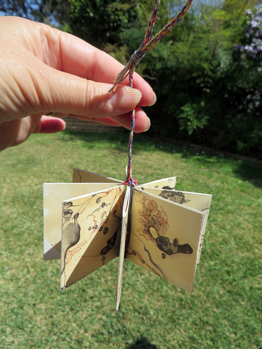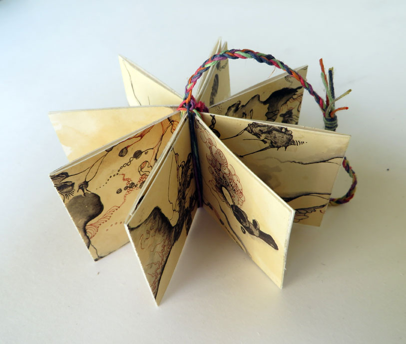 It started life as a drawing. The paper was prepared with a random loose watercolour wash in a sepia or tan colour then blots of liquid pencil added. Scrunched plastic wrap was pressed on top then weighted for a day or so. Once it was dry I started to draw into it, using a fine pen with water based ink. Some of the lines were forced to bleed with a wet paintbrush, and then red ink was brought in. As so often happens with my work, it was then set aside while I decided what happened next. Eventually cutting up and folding seemed the best way to make use of the imagery, and as a result of binding the pieces together with multicoloured cord it turned into a star shape. The final touch was the plaited strap so that it can be hung up to gently turn in any passing breeze. It is a miniature, measuring 10 cm across and 5 cm high.