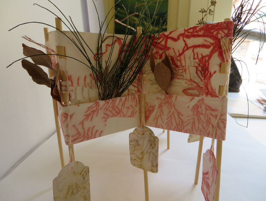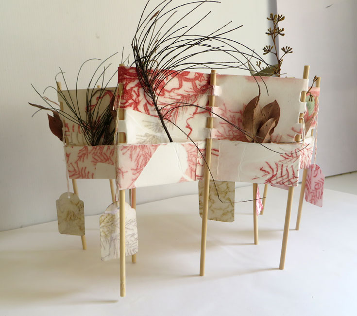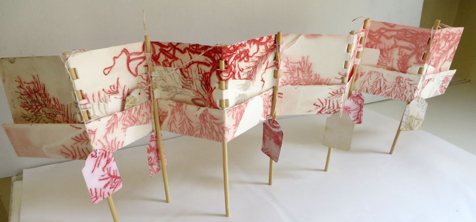 Cuts were made across the folds so that the paper could be pushed against the fold at intervals to make a piano hinge. I inserted narrow bamboo sticks through the folds and hung on them the small labels that were printed at the same time as the main images. The purpose of the stilts was to allow the labels to dangle below the edge of the book, so they could be seen from either side.