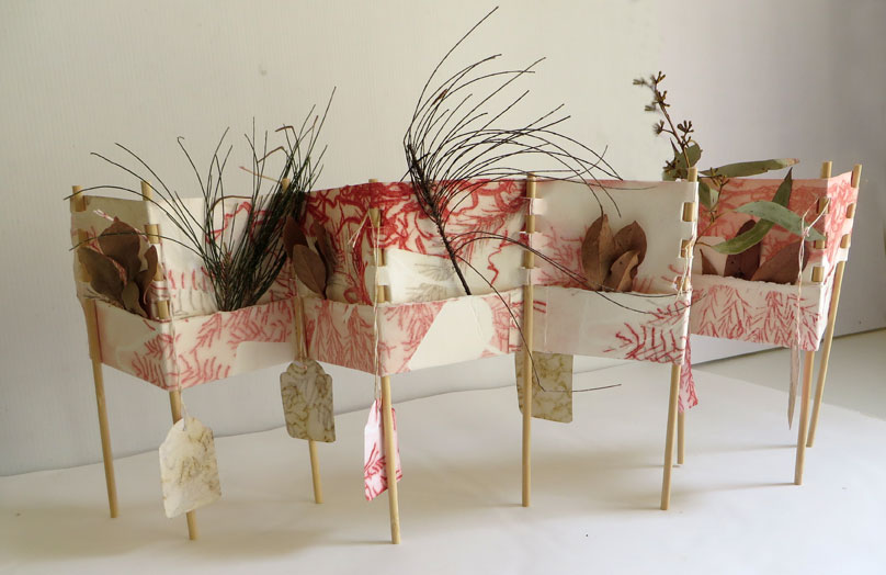Once the book had come to this stage, I had to decide what went in the pockets – I had intended the labels to be tucked in them, but they disappeared as the imagery was the same as on the paper, so I had to rethink. Eventually it came to me that it should be some kind of natural material, grasses or leaves. On my morning walk I found fronds from a pine tree that the cockatoos had stripped off, then a small twig with gum nuts and a few leaves. I already had some dried bay leaves, so they were included too. I am really happy with the way this looks, but it may not be the end. I am thinking of printing some contrasting larger labels that will fit in the pockets as the leaves are not really durable. Maybe the labels will have natural imagery on them …