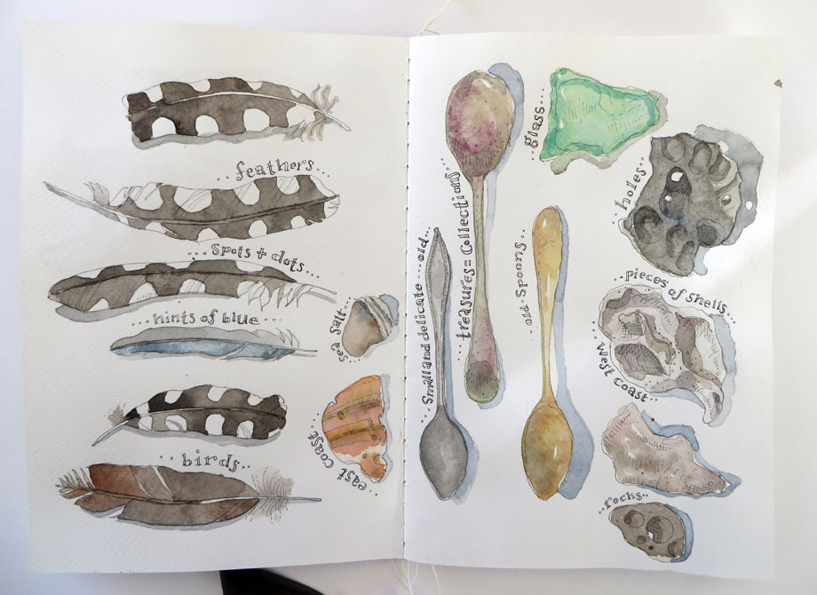 The reason I could use these images is that they are all from my travel sketchbooks, with notes of where each was found. Wherever I go I draw what I find around me, especially things that won’t last – flowers, leaves, insects. I take things with me too – the yabbie claws on the first shared page I still have, but they quickly lose the beautiful rich colours that they start with. Most of these are completely white now.
