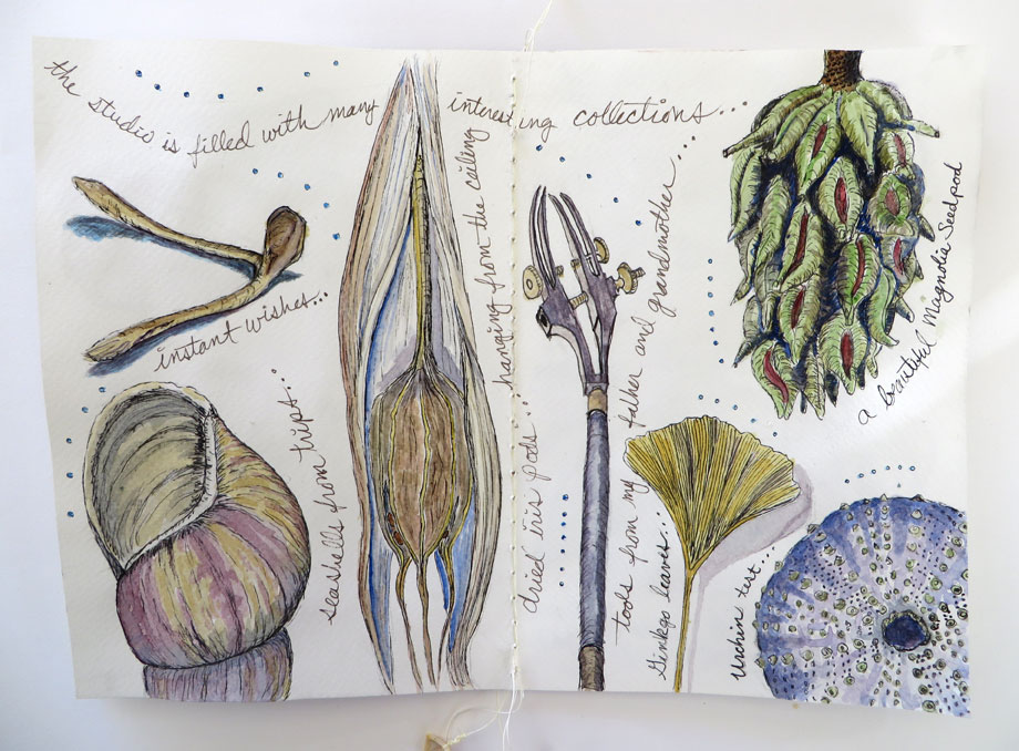 Gale’s page has intriguing objects, every one requires a closer look, she has chosen objects with wonderful shape and form which show off her great drawing skills. The composition of this page is a delight. For more of her work go here.