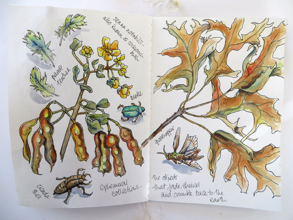In the end, instead of drawing some of the objects on my desk I decided to use my ephemeral collections – that is, objects I have collected but no longer have, as they have returned to the earth. So, a sprig of leaves found in Orange, NSW, a bunch of senna pods with their flowers that were found in Bladensburg National Park in Western Queensland, a grasshopper that ended up on the grille of our car after driving through a dense cloud of them in western New South Wales, near the Weddin Ranges (where the bushranger Ben Hall had a cave, but that’s another story), parrot feathers from Bourke. Then there was a cicada shell found in the Bald Rock National Park on the New South Wales-Queensland border, and a beautiful iridescent beetle from the Victorian High Country.