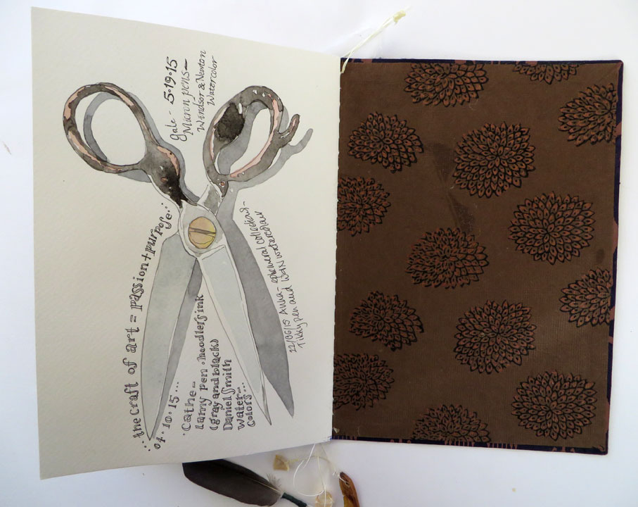 This is the last page – Cathe has drawn a lovely old pair of shears, and we each add some little notes about the media we have used. Now Karen (for more of her work see here) will receive this book and I will receive Gale’s book from her to do my page.