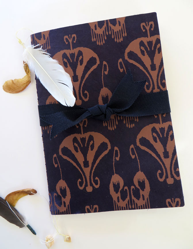 This is the cover of Cathe’s book – made with hand-made paper from Thailand and tied with a gros grain ribbon. Cathe has added some of her collectibles which gently swing around the book – feathers, seeds and shells. For more details about Cathe’s process with book, go here.