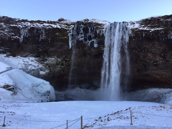 Seljalandsfoss waterfall. The main fall was still flowing, but all around were icicles frozen in mid fall. When we returned two days later, most of the snow had melted, giving us a view of the intense, dark colours of the landscape.