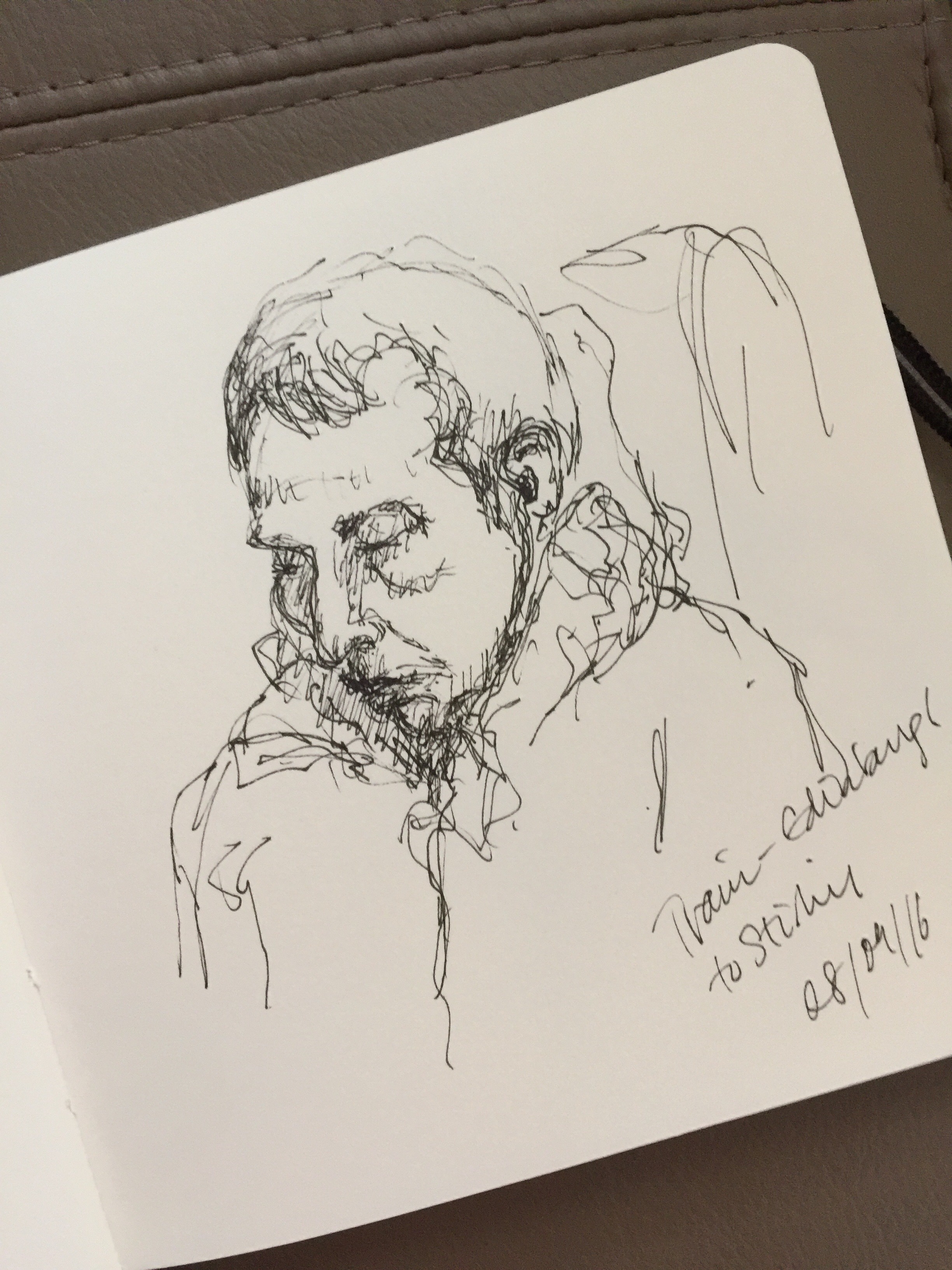 I think two and three were aware of me – number two got up at one point and I thought he had left the train, then I found him a few seats away when I got off! I haven’t done too many of these, just when I’m seated in the right place, but it is satisfying to grab a quick likeness. Thanks Louise!