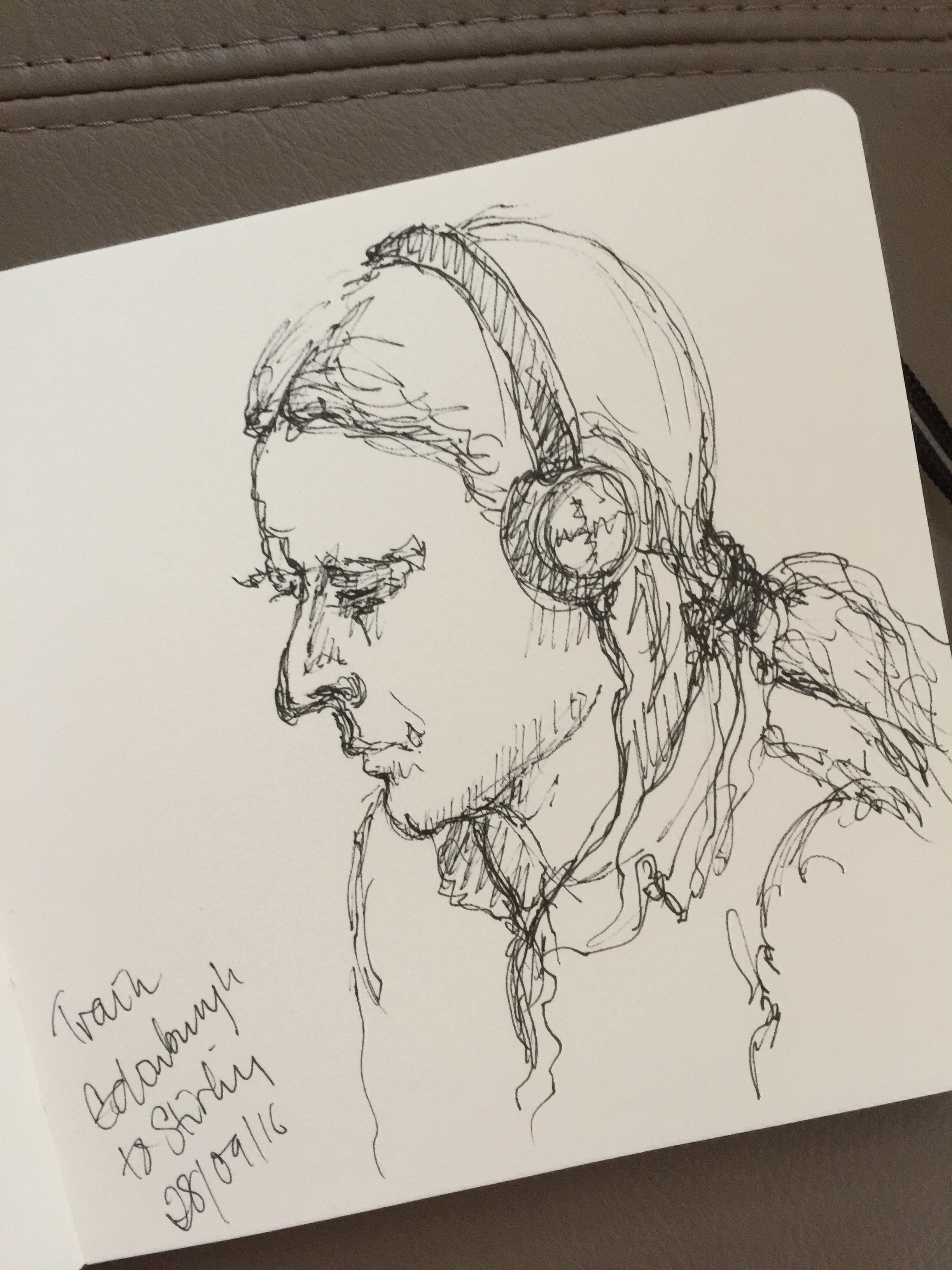 Having a sleeping or otherwise occupied person in reasonably close range is a golden opportunity for sketching. So a train journey is pretty good – the best position is across the aisle, so my subjects are in seats facing the other way. I don’t want to be observed so sometimes have to pretend I’m doing something else, but as soon as they are asleep again or immersed in their laptop, then I can continue. These were done between Stirling and Edinburgh or Glasgow, in my small square sketchbook with a Staedler pigment pen.