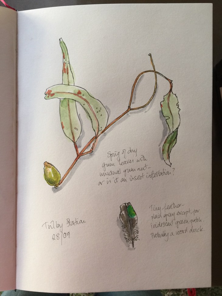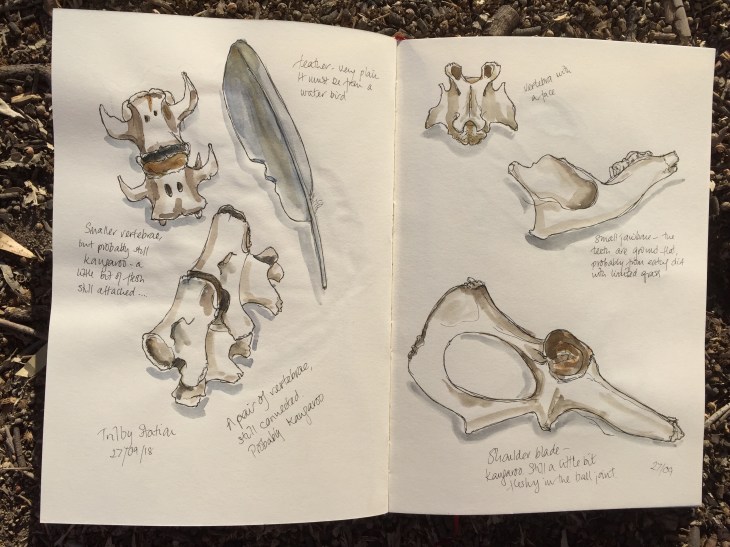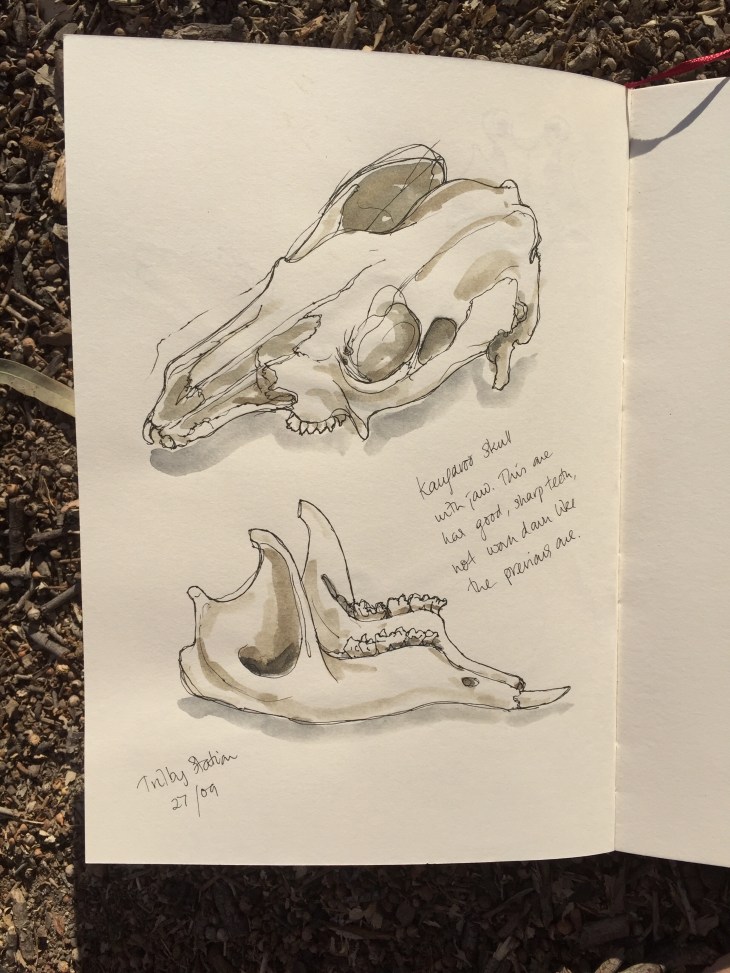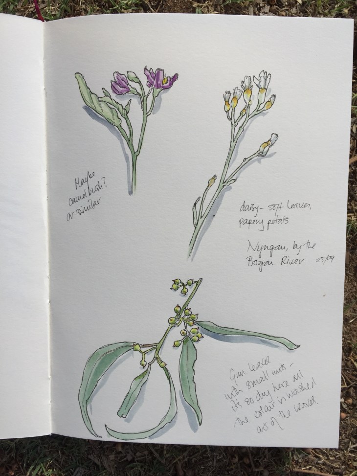 In late September we packed up the camper trailer and headed towards the west of New South Wales, to camp on the banks of the Darling River, one of the great rivers of Australia. This year has been severely dry, and the vast majority of NSW was declared to be in ‘extreme drought’. The river was very low, mostly pools rather than a healthy flow. In summer you expect to see parched landscape but usually at this time of year, in spring, there is some green to be seen, but not this time. Even the big gum trees are pale, the colour sucked out of them. This also means there is little wildlife, the birds, kangaroos, even the big lizards seem to have gone searching for food elsewhere. The only animals we saw a lot of were goats, and even they were looking tired and thin. So searching for things to draw was not such an easy task. Plenty of bones, and some hardy plants and trees but little else. This sounds depressing, and in many ways it was, but the landscape is still magnificent and has an ancient power to it. We camped with friends, then met a group of people who have the same camper trailer as us, made some new friends and enjoyed the old ones! I’m doing this post on my phone, so quality control could be an issue, so forgive me for any oddities!