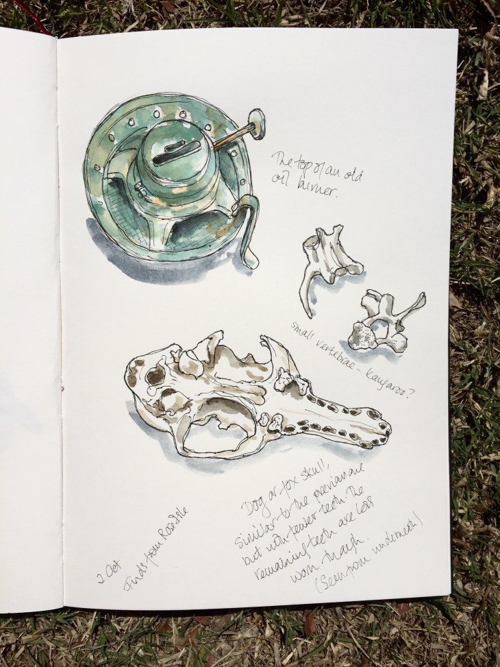 1. In some ways I prefer to draw things that most people would pass by, rather than the objects that are intrinsically beautiful. I do find that I see more in objects once I start drawing them than I did even when my eye was originally drawn to them – the skulls and bones are a case in point. They almost metamorphose as I am looking at them. But this time it was difficult to find subject matter, there usually are fruits, seeds, flowers, feathers – there were almost none of these this time. I would love to go back to these places again after a lot of rain – they would be transformed.