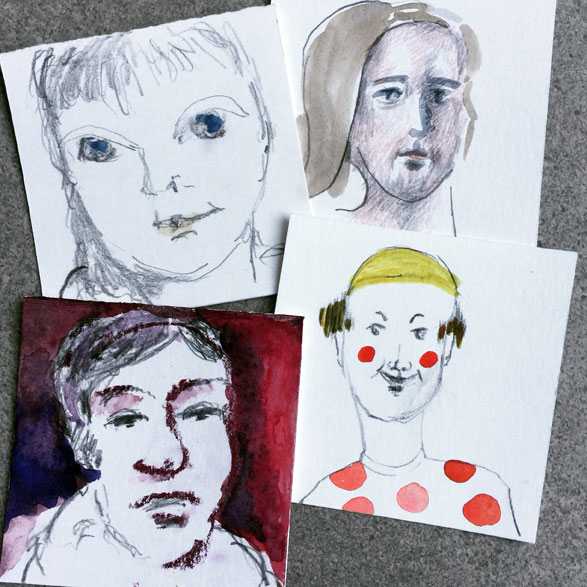 The letterbox collaboration has now added portraits to the mix and its been fun! We are keeping the starting marks very simple so there is room for interpretation in any number of ways. These are 10 x 10 cm, once again small enough to easily pop into a letterbox, and still using any available materials.