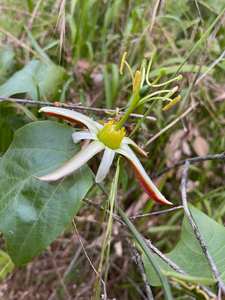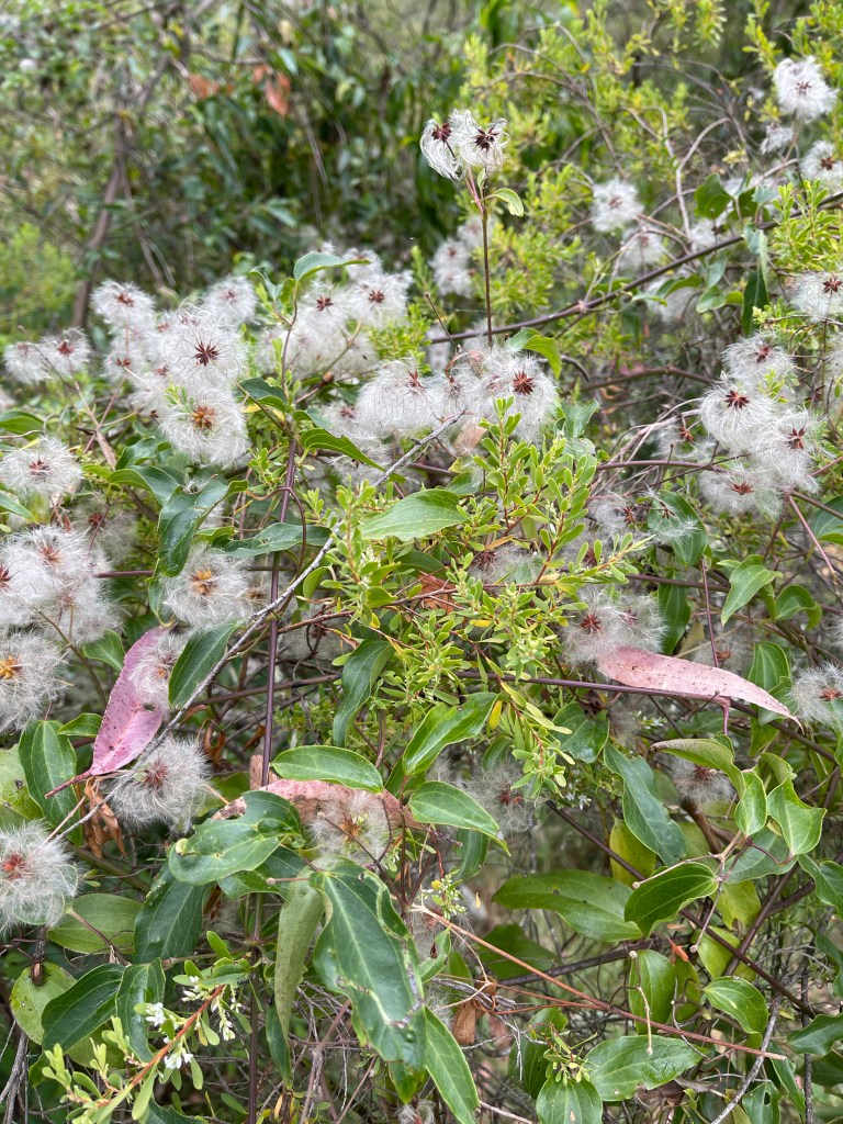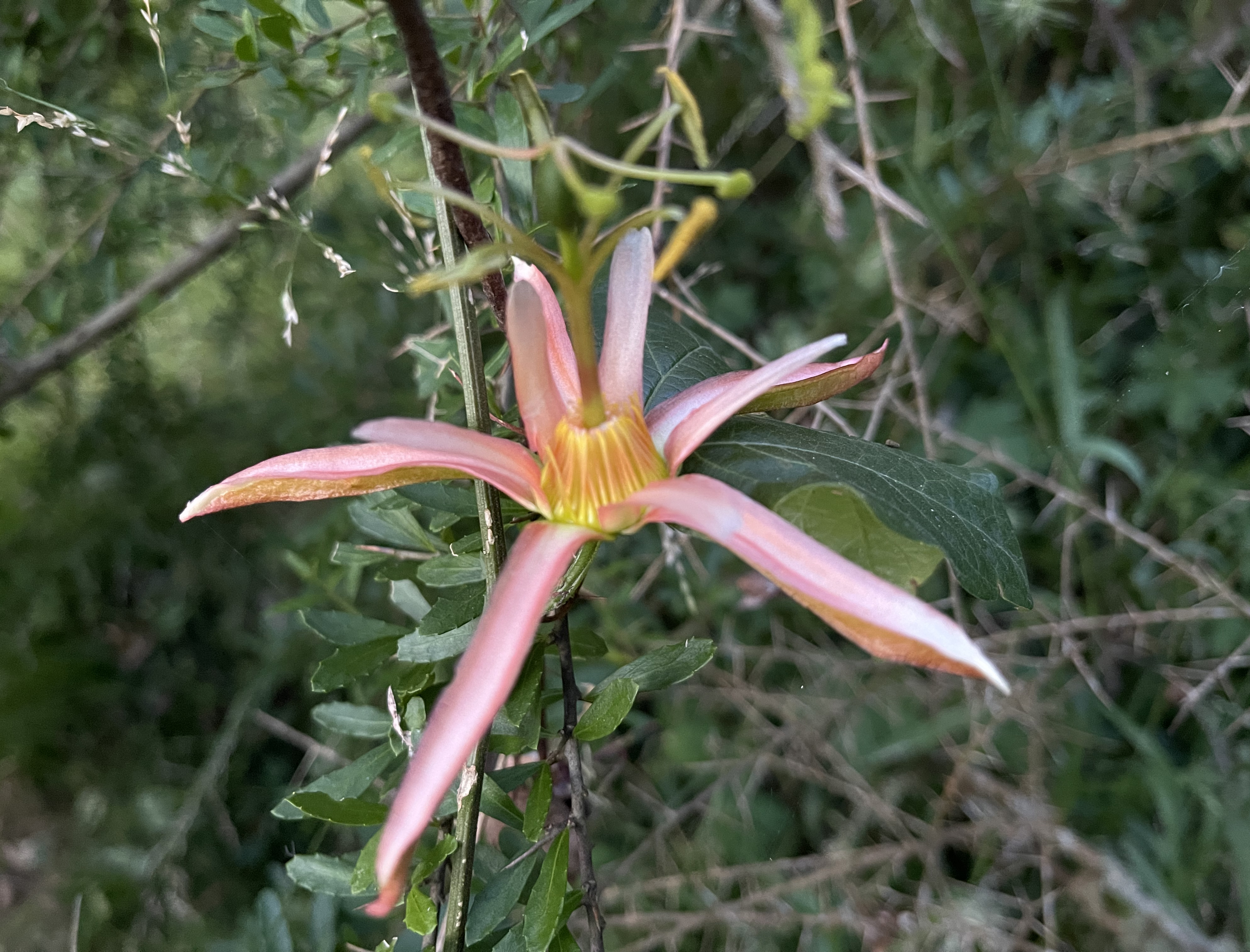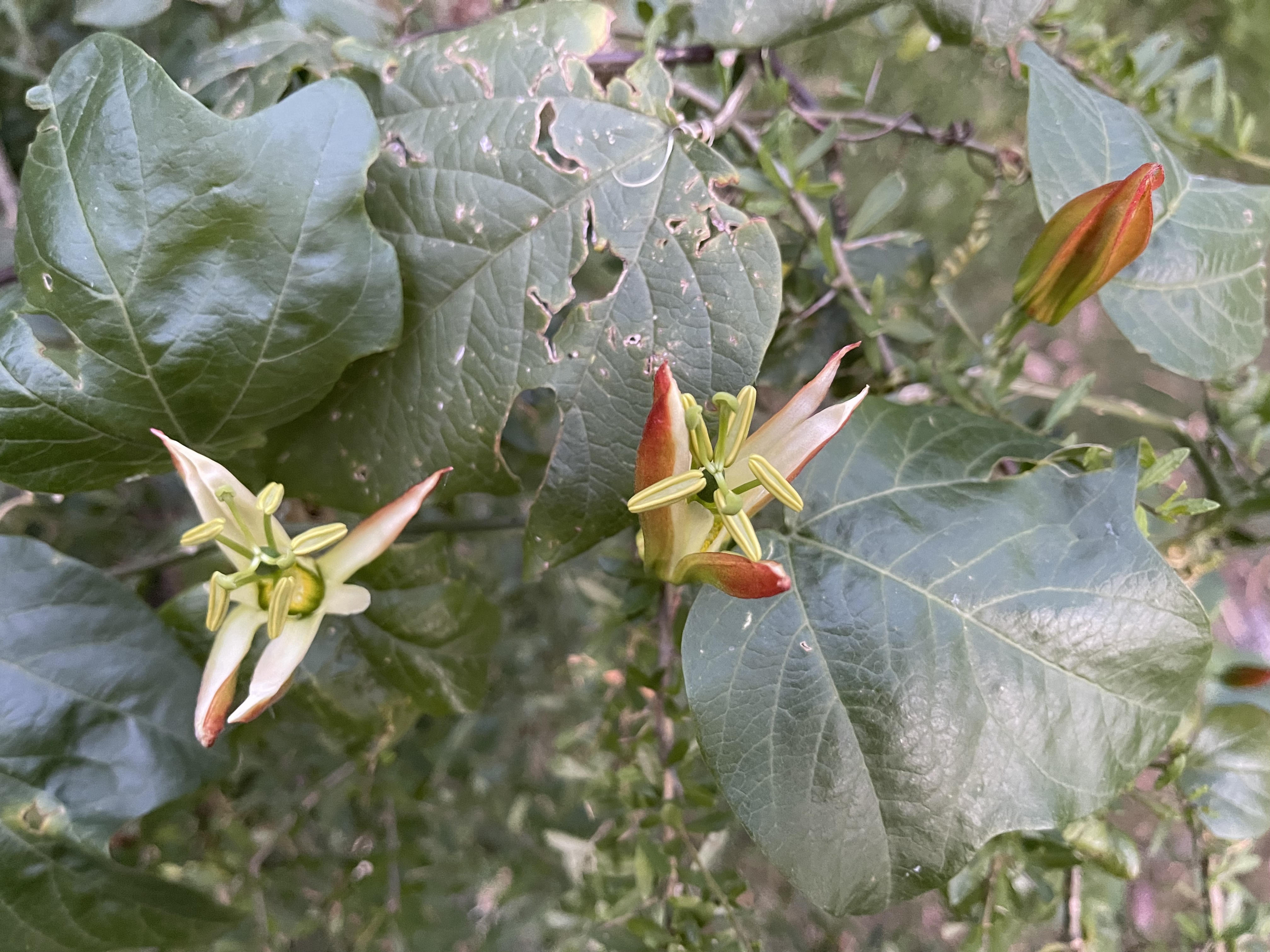 In this small park I found several plants I hadn’t come across before, the most interesting being a native passionfruit, which was in flower. Some of the flowers were cream, others pink, and clusters of unripe passionfruit hanging from the vines.