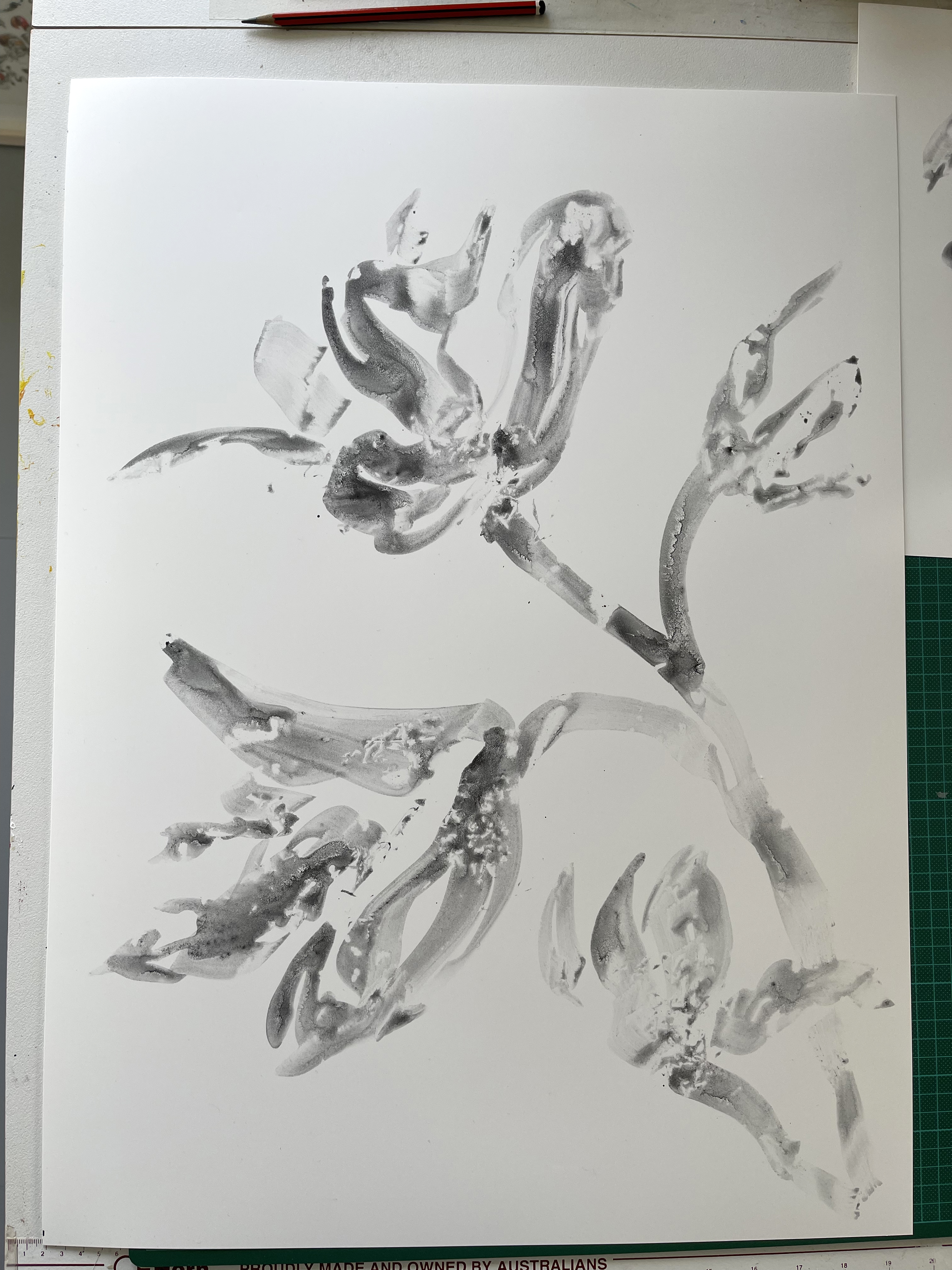 Inspiration from my drawings can come from anywhere, I don’t remember where this came from – it may have been a native plant, or from someone’s garden. It may have been tiny, or enormous, it doesn’t matter, it is merely a starting point. The drawing has retained the multiple branching stalks of the original, but not much else. My base marks led me off in new directions, changing the form and nature of the plant, taking it from the everyday to a new and strange place. It is ready to take on the world …