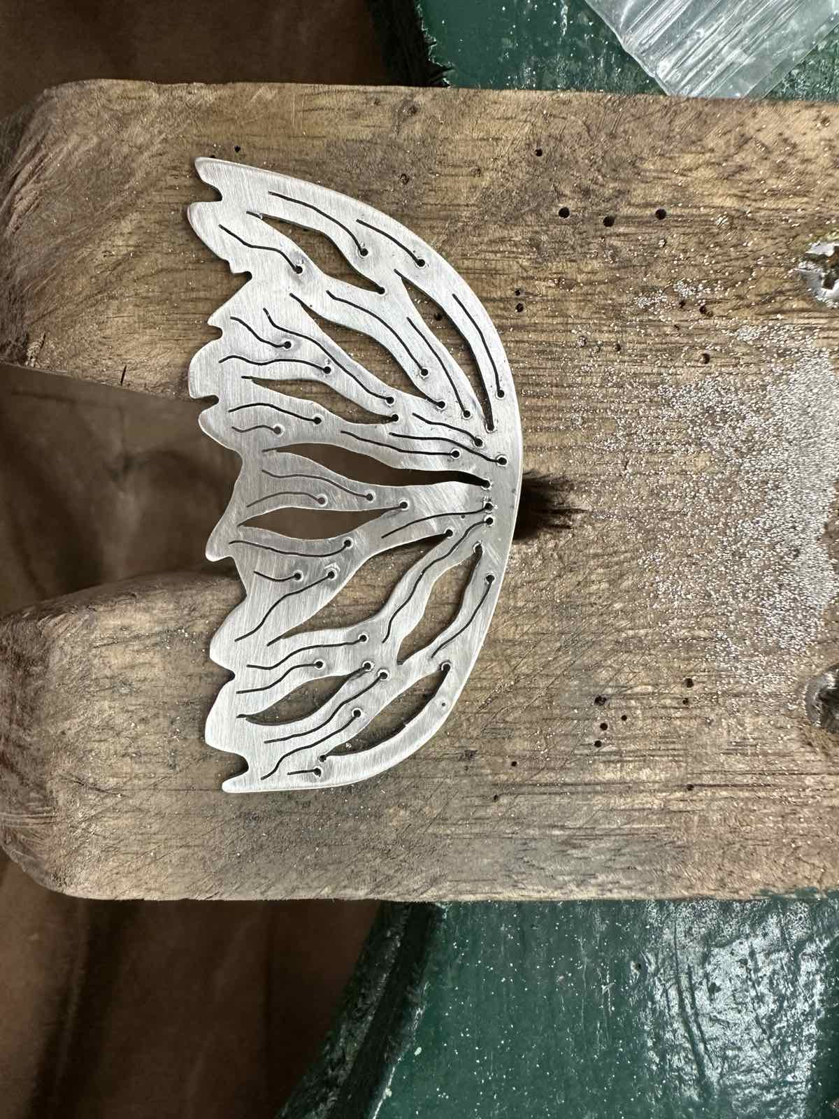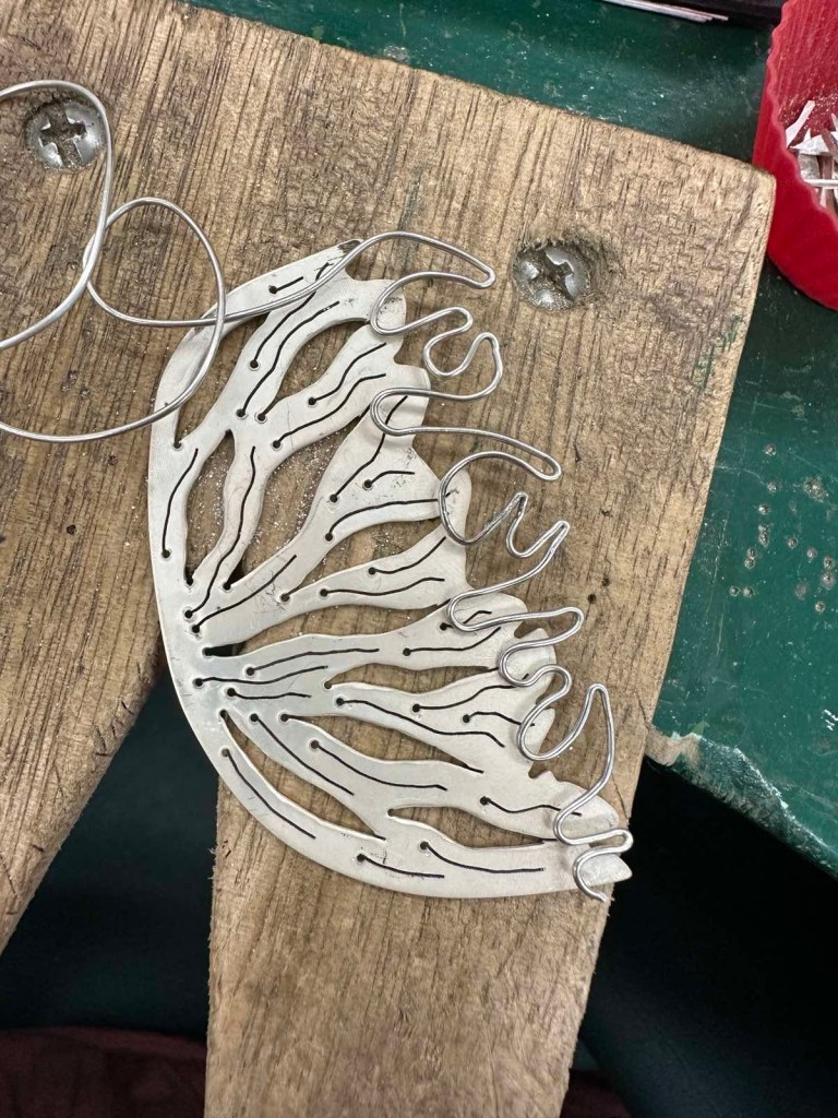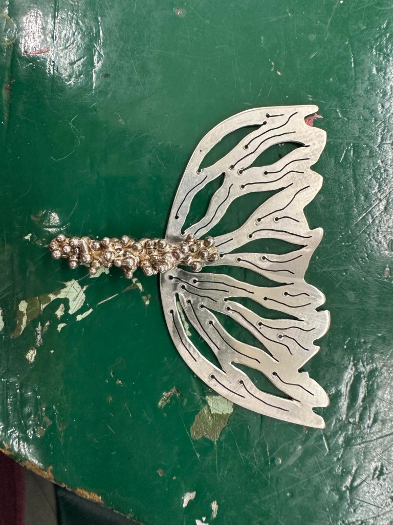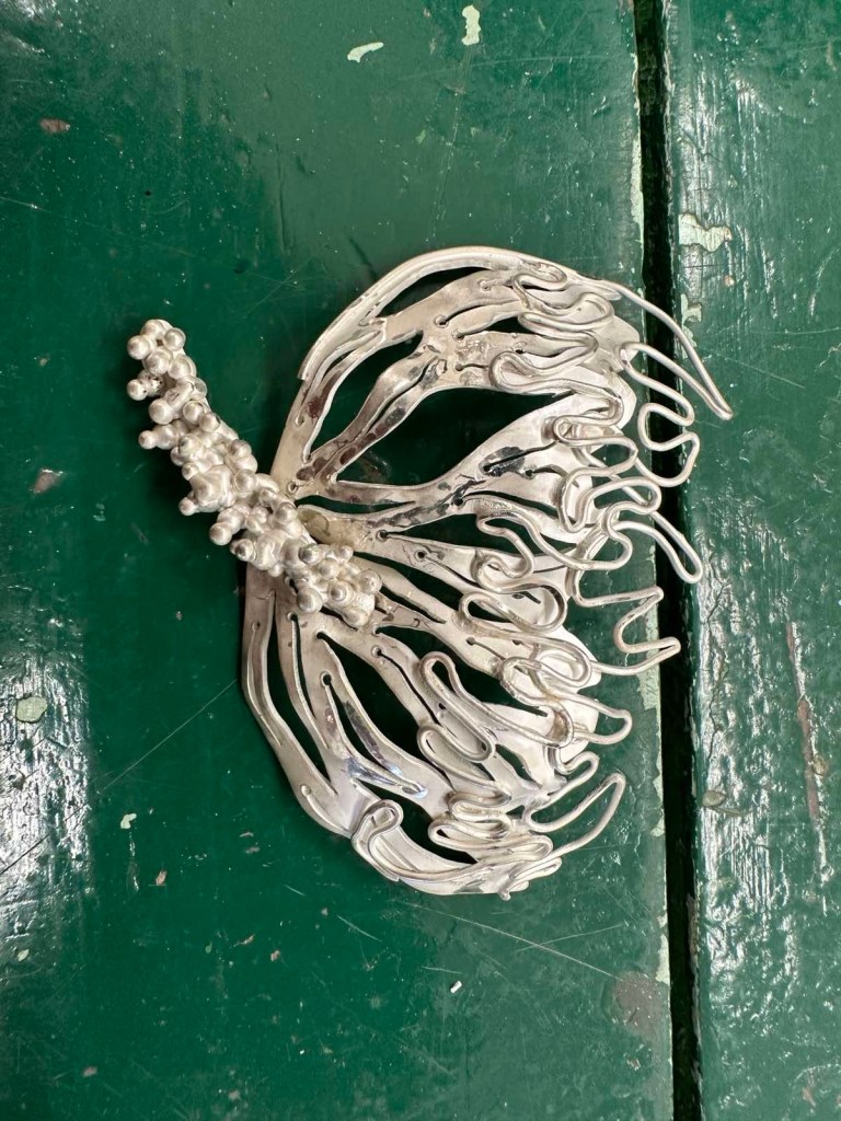 Everyone in her jewellery group became interested in her project, her teacher even offering her the use of her own jewellery studio for some of the trickier elements. Eventually, the birthday arrived and I could see the brooch. To say that I was delighted is an understatement. It is the most beautiful object – it is not a copy of the drawing, it is an interpretation of it. In the way she has used the silver it has taken on the shapes and forms in my drawing but taken them to another dimension. Below are some of the progress steps of the development of the brooch. Her months of hard work have created a unique piece of art that I will wear with immense pride and joy.