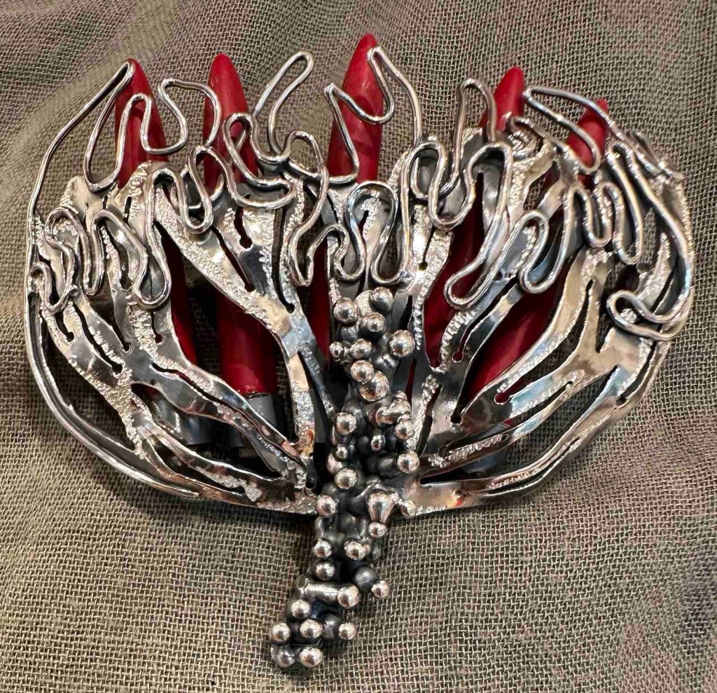 The brooch is an exquisite jewel inspired by your drawing. I wonder if you could explain about the red parts; what is the material and what was the process of including them? I’m intrigued. This is a family heirloom if ever I saw one.