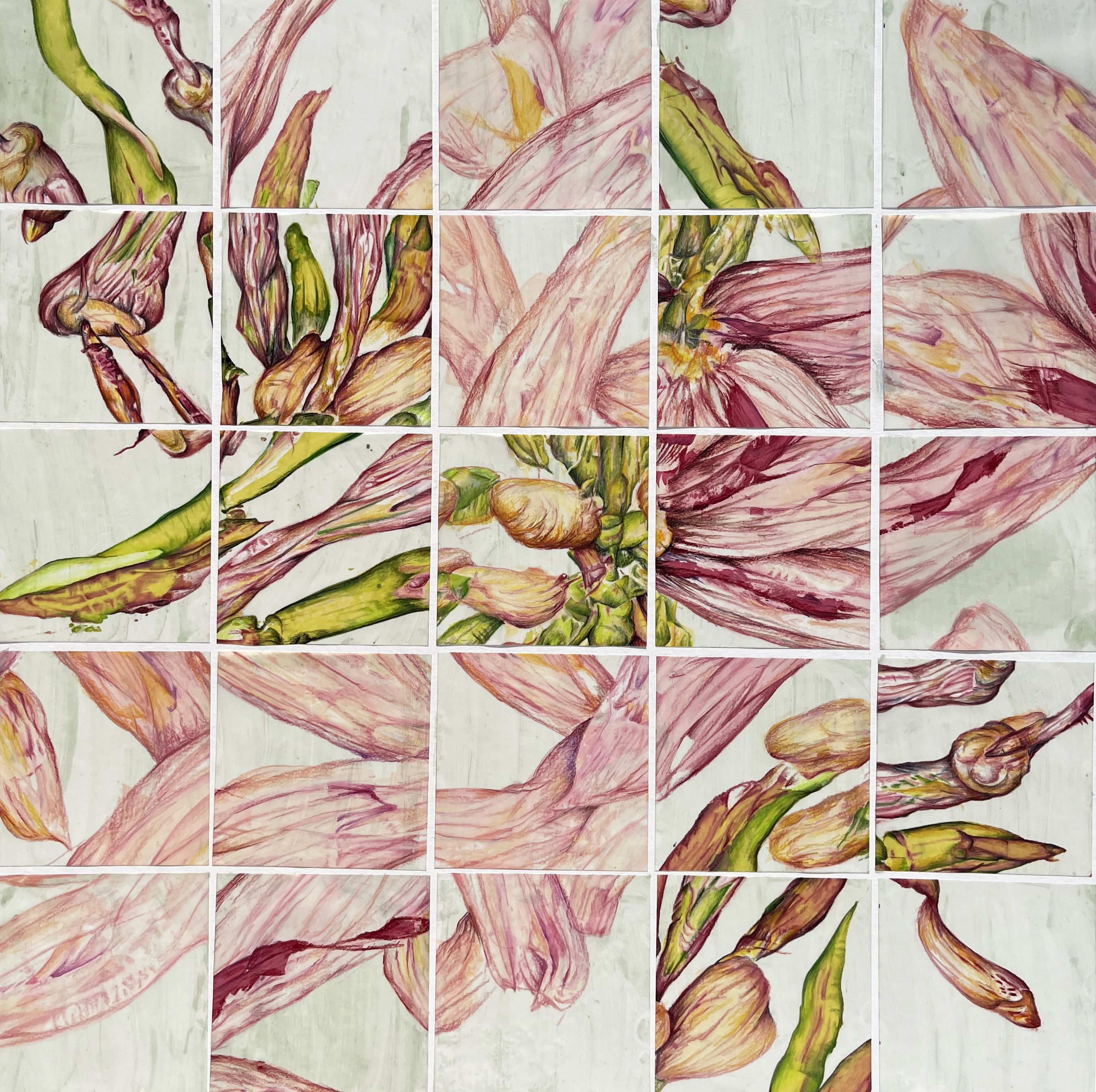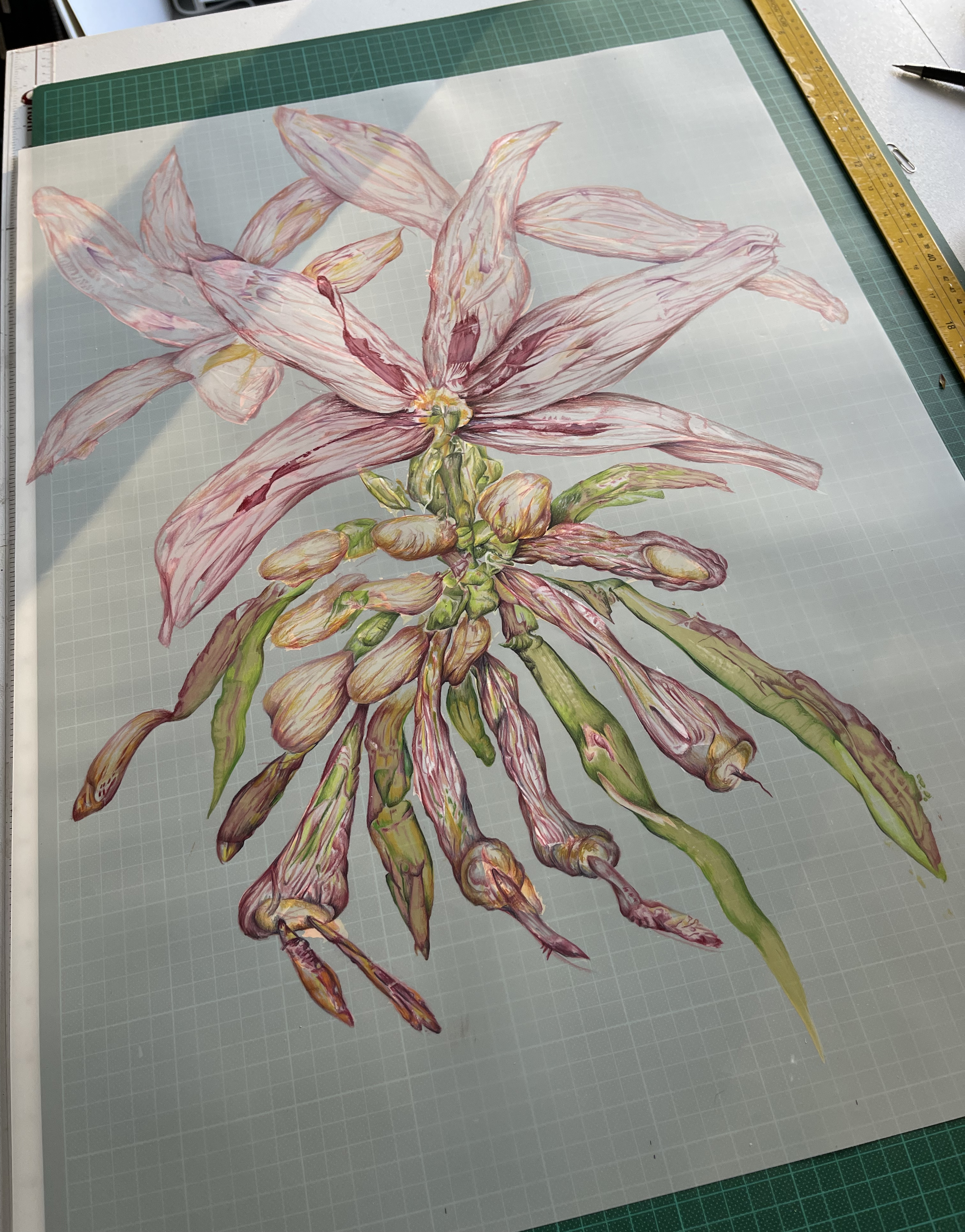 Many stages have led to this artwork. It began life as an interpretation of a lily-like flower, painted very roughly on a large piece of translucent drafting film with acrylic paint, applied with a broken credit card. I later drew into the image on the reverse side of the drafting film with coloured pencils, enhancing the marks and intensifying the areas that offered the opportunity for new development.