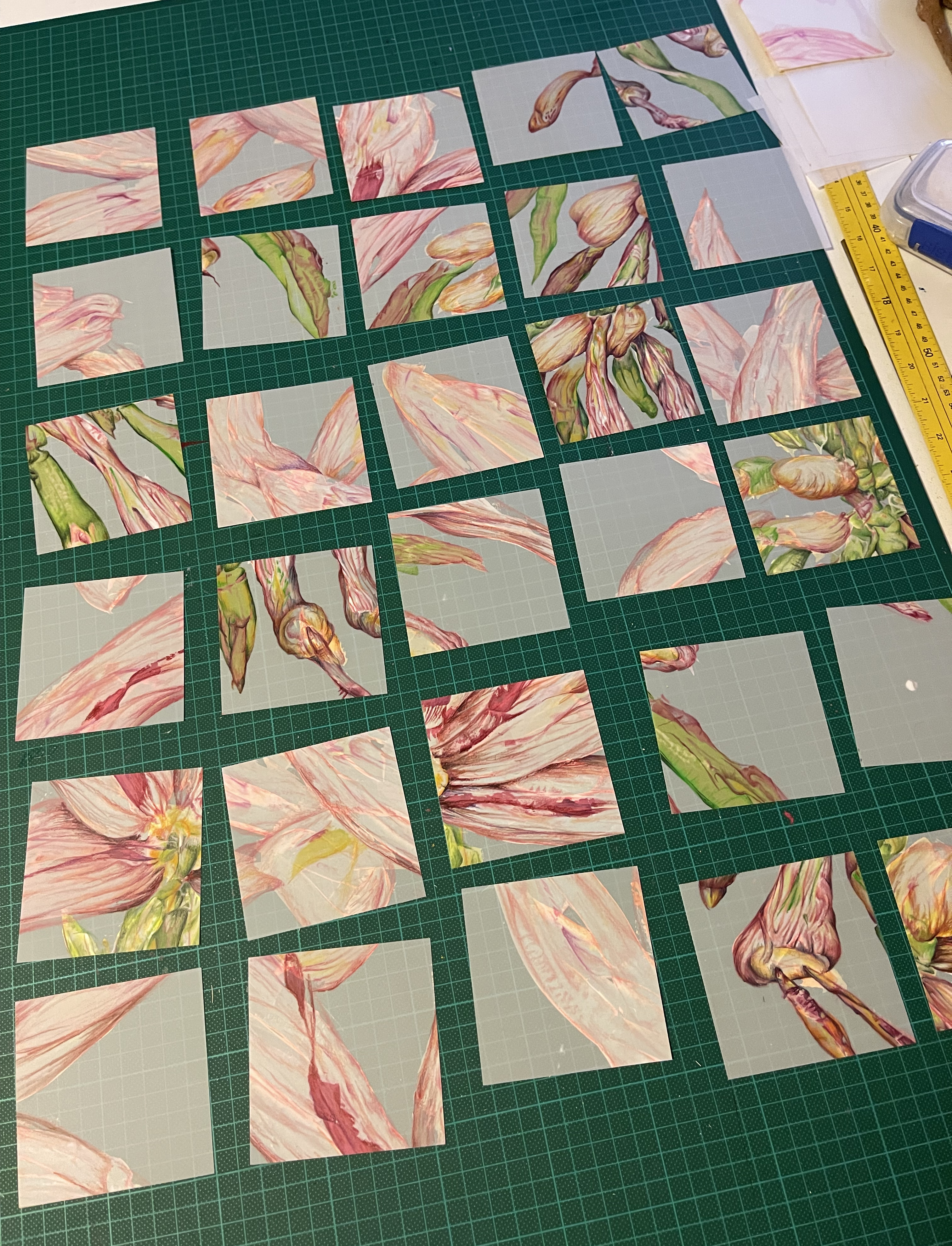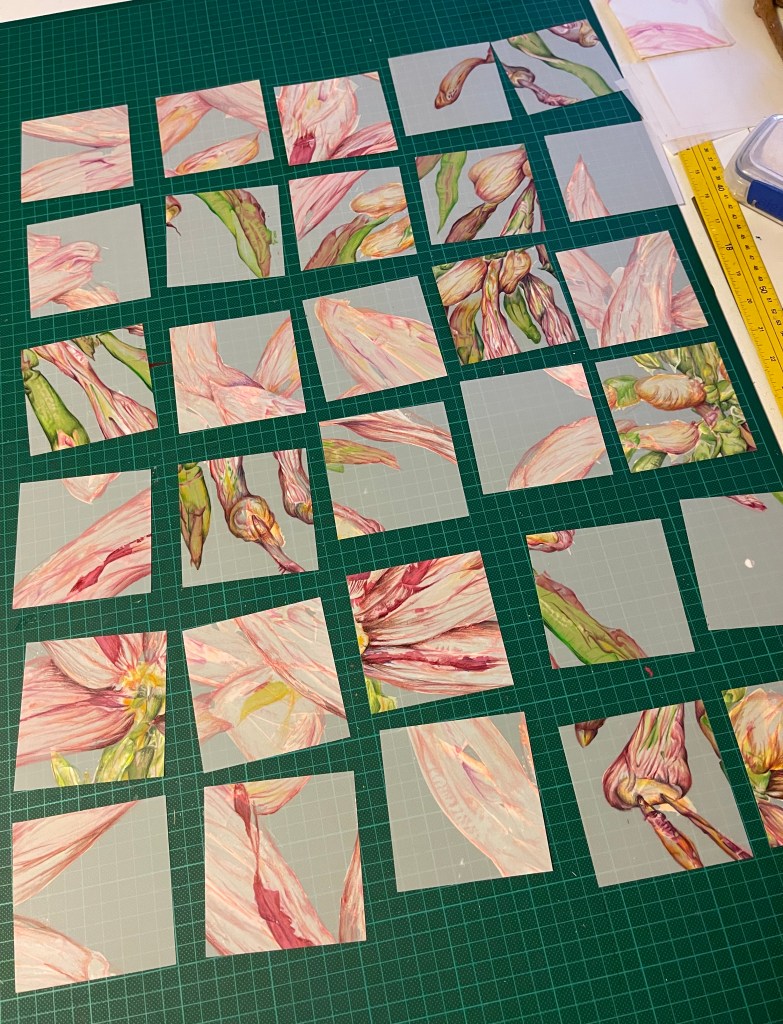 Once I had cut it up, it sat on my desk for a long time, I would rearrange the pieces every time I went past, then gather it all up and put the pieces away again! The final paring down was where I finally felt comfortable with the arrangement. I do have quite a collection of the unused panels, some completely blank, others with a small amount of imagery, ready for something new!