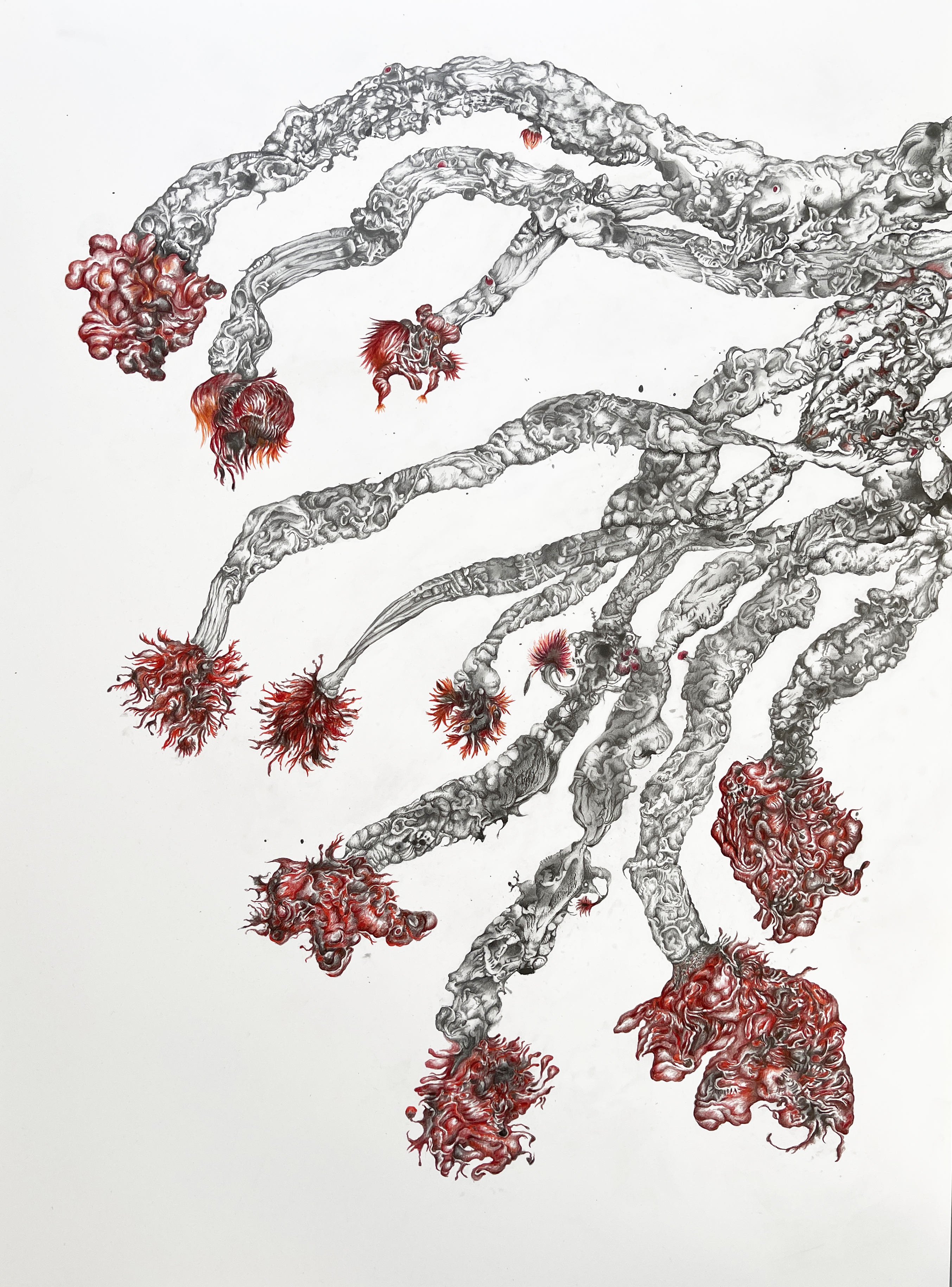 Beginning from simple elongated, twisting marks, originally inspired by the stamens of a flower, this drawing developed as it went. I had deliberately decided to concentrate on using graphite for the main structure of the drawing, but as it went colour demanded to be included, initially in small areas within the tendrils, but leading to the inflorescences at the end of each tendril.