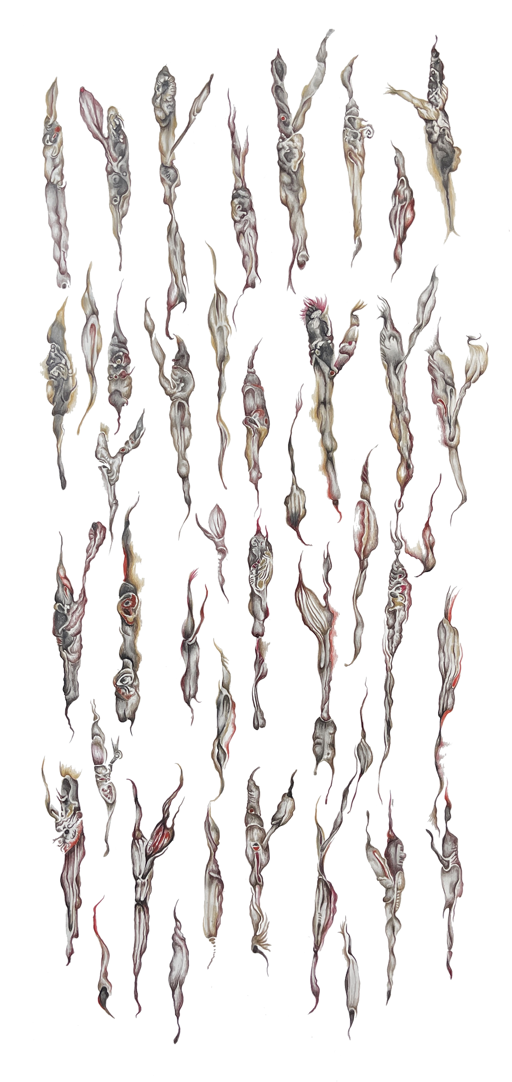 I love the thought that this is as strong as a tree trunk! I was quite conscious of the negative spaces, in this drawing in particular they are important for holding the equilibrium. It is more subtle, colourwise, than my recent work, and was very calming to work on.